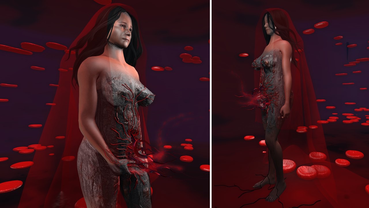 Tomm Pye is Dutch and in Second Life since 2017. He paints and designs in 3D. Tomm created a 3D installation in his corner of of the exhibtion at La Maison d’Aneli. It is a white room filled with red particles, blood plates. There’s some statues at the walls, in the center are several heads and a pumping heart, you can see something like the small bowel at on wall, you see a the bones of a thorax. Acutally I guess you find everything of the human body somewhere in Tomm’s installation. It is like walking through body. You have to see it yourself.