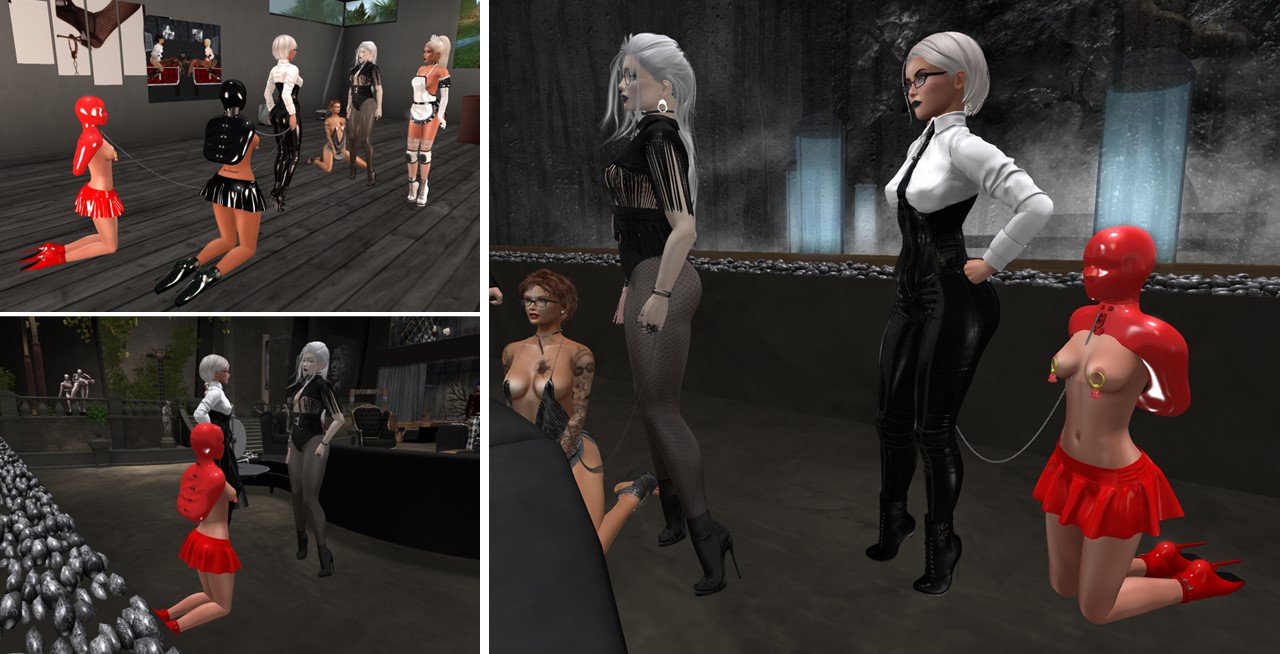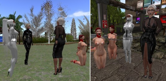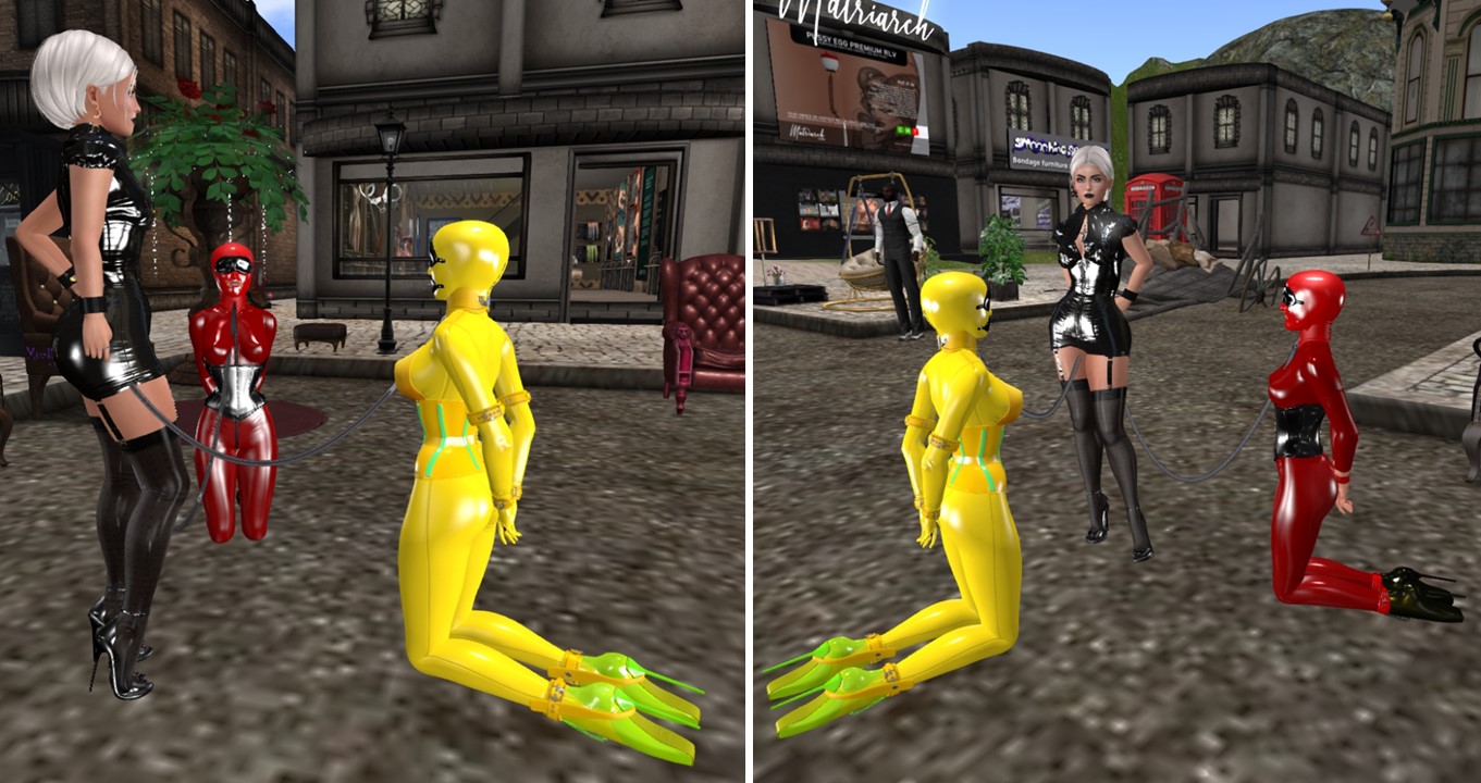 At night, when I came inworld, Flo was playing skipee and slave Holly was in her room. After I had unlocked her room, slave Holly gave me a letter from Mistress with instructions for me ….. slave Holly would be allowed to address me with “Sistress” and I was to follow slave Holly instructions as it were Mistress’ instructions…. slave Holly locked my cuffs (Mistress had prepared them leaving my keys out and out of reach for me) and leashed me. Then we went to see Flo. slave Luci was also present at the table. Holly told me that she was instructed to take me shopping. Flo accompanied us along with Alessi who had also shown up. slave Luci stayed at home.
