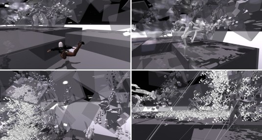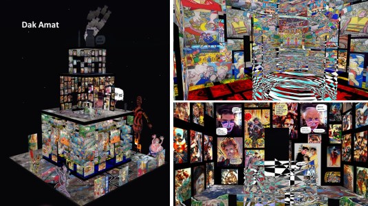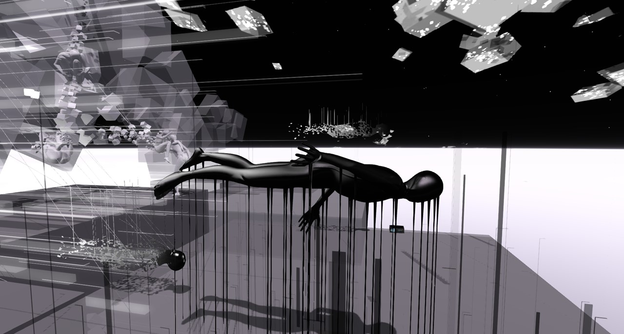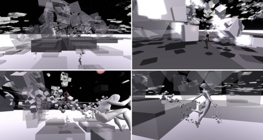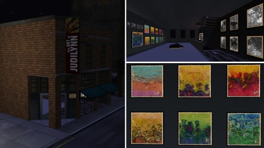 Vita Theas used her skybox at La Maison d’Aneli for a space installation on a lower level and for displaying her pictures on the ground and upper level. The space level shows several celestial bodies. I recognized the milkstreet, asteroids and the planet earth. A figure is using the earth to ride on it like on a cannonball.