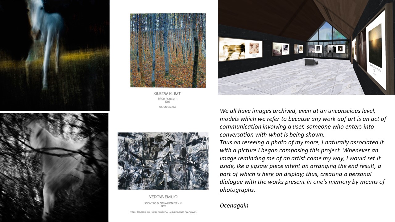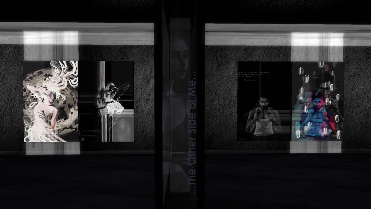 Maddy wrote: ““Reflections” is a journey of portraits that experiments with new ideas using A.I. technologies. The exhibit showcases photos created with Midjourney and Second Life Avatars, combined with the use of A.I. to create a melancholic and dark atmosphere that captures the essence of the subjects portrayed. The soft colors and blurs emphasize the intense emotions and intimacy of the portraits, inviting the viewer to immerse themselves in the images.”
