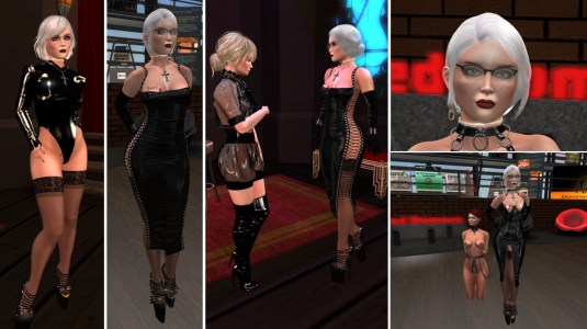“Just a quick word from Kitty: Not really much to report. The usual shenanigans, moving idling avatars to permanent parking locations, teasing puddles every day, and roaming about SL to find new, interesting people and experiences. On that note, Kitty spend the weekend training maids and slaves as the executive assistant of a company boss that deals in … who guess it: slave trade. Was a lot of fun. Only that by Monday, no more maids and slaves showed up at Kitty’s class room. Kitty also ran into Poppy from Poppy’s Hangout (a transformation sim). She shared that her latest creation was a mono-heel. Basically, a single boot for both feet with one heel. It comes with a tight skirt and looks great when combined with a corset. She gave Kitty a copy and Kitty thought you might consider it for one of the future monthly outfilts. It can be locked and works pretty well though there are still some minor bugs here and there. That’s about it for the news. Oh, right, and a lot of people seem to be interested in Kitty’s nipple rings and the sign that hangs from it.”