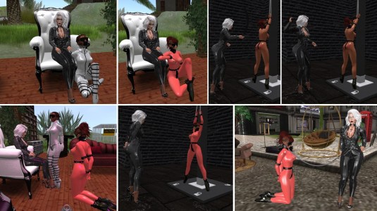 Monday, May 2nd, I got a message that Mistress Jenny arrived safely at her vacation destination. I was inworld at night and it became a nice, varied and busy night. slave Lily was present and slave Holly came inworld just a few minutes after myself. We first inspected slave Holly’s plot and the puddle that Kitty had left for her. Then I took slave Lily (Lily Bloodrose) and slave Holly to ur sun terrace – and slave Luci (Luci Glendale) joined us there. It was the perfect moment to get the slaves into their May outfit, that consists a catsuit, ankle ballet boots, a chastity belt, the full vixen set, RR Deluxe gag with blindfold and the AnaVision HUD. Each slave gets another colour. Flo got white and Alessi red. For slave Luci I picked navy blue and for slave Lily pink. slave Holly needed a catsuit and I got the full set of marine’s catsuits for her and finally decided for a light transparent red for slave Holly.