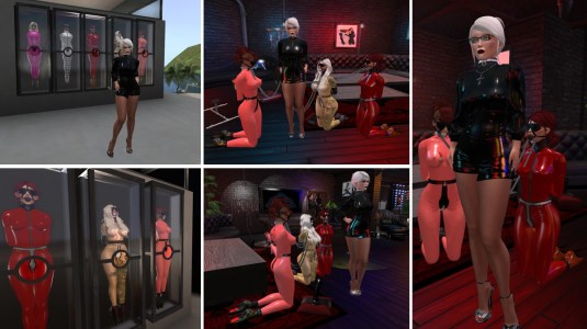 For this month’s Enjoying Bondage series I selected a picture that I took on May 11th. The picture is not a collage of several pictures. We have two glass wall cages at the entrance of our house that we can use for display. That night I had a quite full house at home and I decided to rezz a few more cages to take this picture. I restricted all slaves and put them on display.
