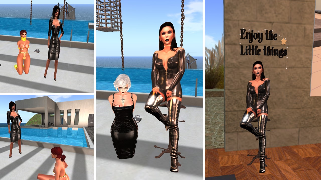 August 16th: Diomita and slave Lily at club Domme a Domme / Diomita at home at Jenny’s memorial / Diomita and slave Lily at the landing point / Diomita at club DeLust with Angelique, Flo and slave Lily