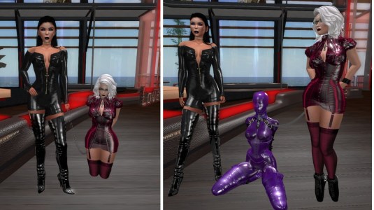 We went to club DeLust next. For a change Mistress leashed me to a hook at the wall and made herself comfortable on a bar stool. We saw another guest wearing a long latex skirt and a corset. Mistress asked her to move around and she hobbled, makeing really small steps, quite realistic. Mistress had bought such a long skirt for me at NGW two days before and she wanted me to show it to her. Hence I changed. The skirt looks good and restrictive with the corset and Mistress locked my corset. Mistress unleashed me and I walked around, but I did not hobble. It turned out that the other guest had a custom made hobble animation – shame. I tried several alternatives but none did convince me nor Mistress.