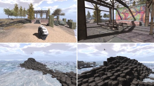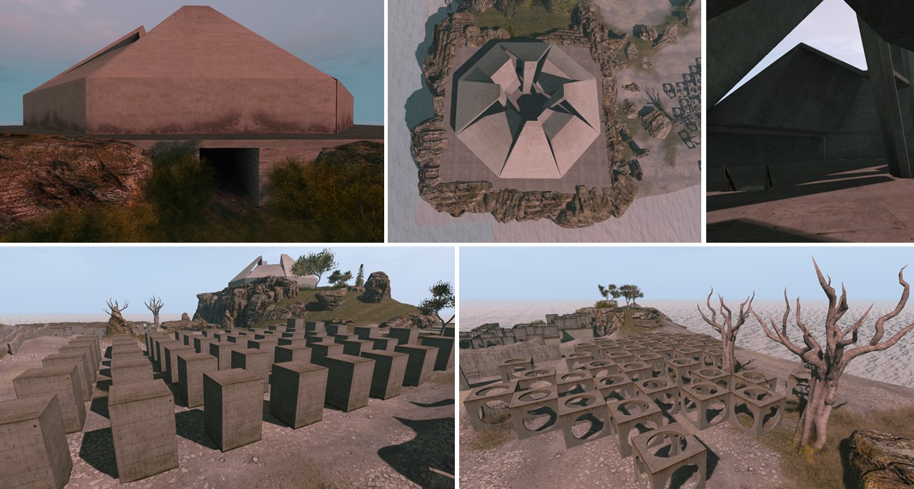 The landing on Grauland is on a pier that leads to a high stairwell built into a steep rock. I walked up the stairs and from there you have a first overview over the sim. Stairs lead down again into the rock. Actually the rock is hollowed out and contains a quite complete infrastructure for soldiers to live. I first explored the headquarters, a building with a control room, a cafeteria, conference room and a lounge.