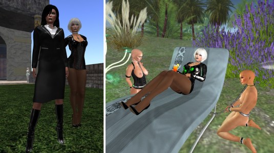 September 28th: Diomita with slave Flo and slave Gwendi at home in front ot “Flo’s Heaven” / Diomita with slave Gwendi at Mesermize Dungeon and at home