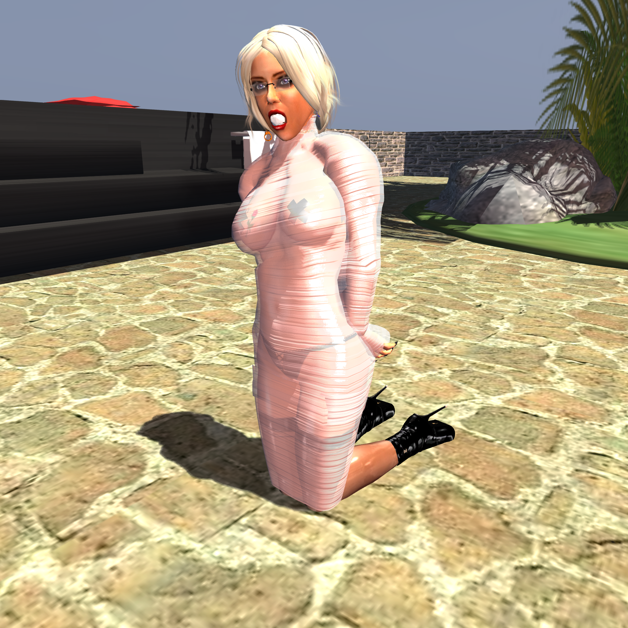 We had no bondage night in July so far, but we enjoyed bondage nonetheless. Let me first report about Marine Kelley’s mummy set. I saw the first pictures of it first at deviant art and they looked amazing. Of course I had to get it and I tried it secretly at home. Basically the mummy set it is made to wrap someone up in latex, duct-tape, wrap or plastic. The gear isn’t easy to set up, you’ll need time and patience. And honestly I was a bit disappointed about the effects. It doesn’t look as realistic as in the pictures I saw. The effects can only be seen when the advanced lighting model is turned on in the viewer (that slows down the performance thus I use it just for taking Pictures). And then you still need the right light and the right angle to get the effect you desire. After a while I got some nice Pictures of myself wrapped up and I also wrapped up my dear wife. So as a starter for this post, here are our “mummy” pictures.