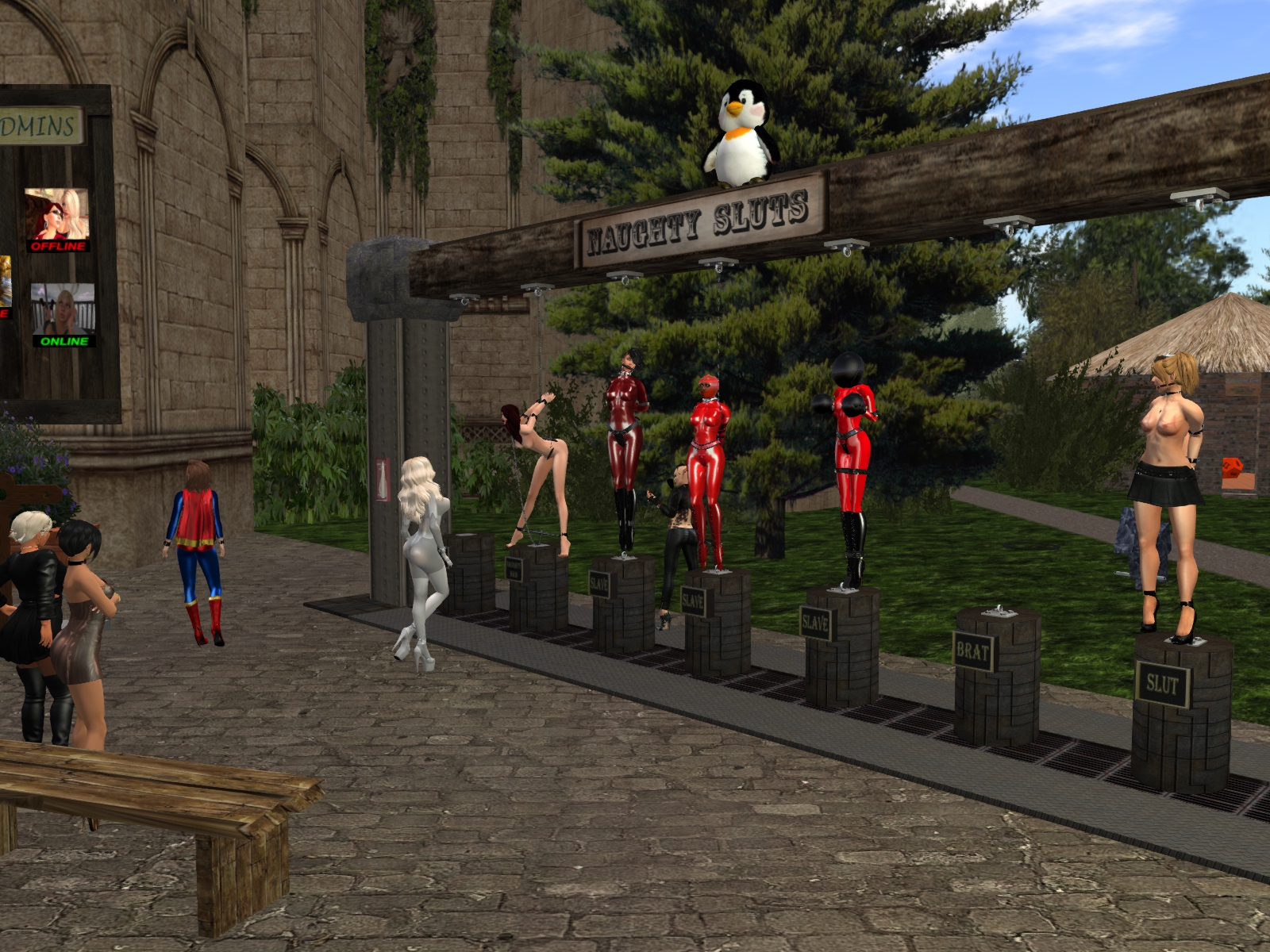 Yesterday the display stand at Lochme became really full. sklavin Gebby came online, so I had 3 slaves on display. Then 2 other Subs were also exposed. That made a lovely picture. Jenny was online in the meanwhile and Starry (Starbright.Wingtips) teased the slaves with her crop. They did enjoy the attention for sure!