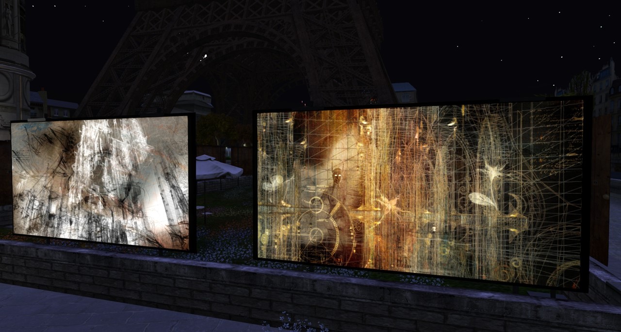 The notecard, that you can grab in her exhition room at michiel Bechir Gallery contains a long list of her exhibitions in-world so far as well as links to other publications of her. Myra writes for magazines and blogs, in partilar she is a staff member of Kultivate/Windlight Magazine. You find more of her art at her flickr page and on her own blog.