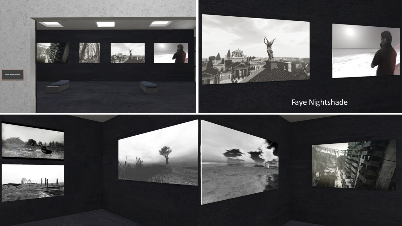 On the 1st floor to the right you find the art of Myra Wildmist. According the the theme of the July exhibtion, Myra presents portraits, female portraits. One wall shows portraits of different characters and ethnics with different techniques for portraits, another wall is dedicated to females as an element of highlightening an otherwise boring landscape or background. I personally like her self portrait, which she presents herself with 3 different filter settings – quite a difference in my opinion, and proving what can be done within Second Life photography using simple filters.