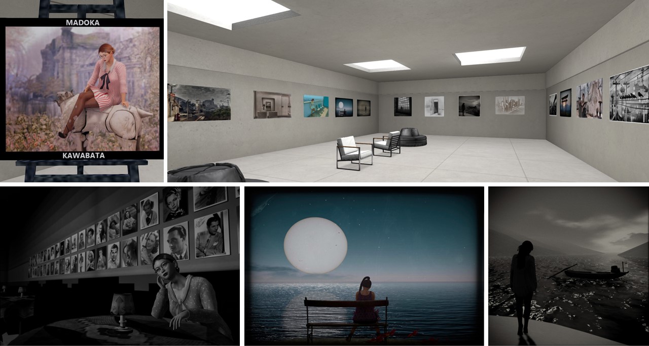 On the 1st floor to the right you find the art of Myra Wildmist. According the the theme of the July exhibtion, Myra presents portraits, female portraits. One wall shows portraits of different characters and ethnics with different techniques for portraits, another wall is dedicated to females as an element of highlightening an otherwise boring landscape or background. I personally like her self portrait, which she presents herself with 3 different filter settings – quite a difference in my opinion, and proving what can be done within Second Life photography using simple filters.