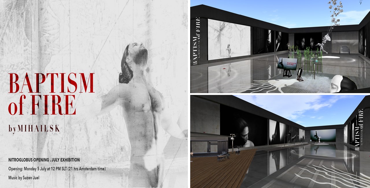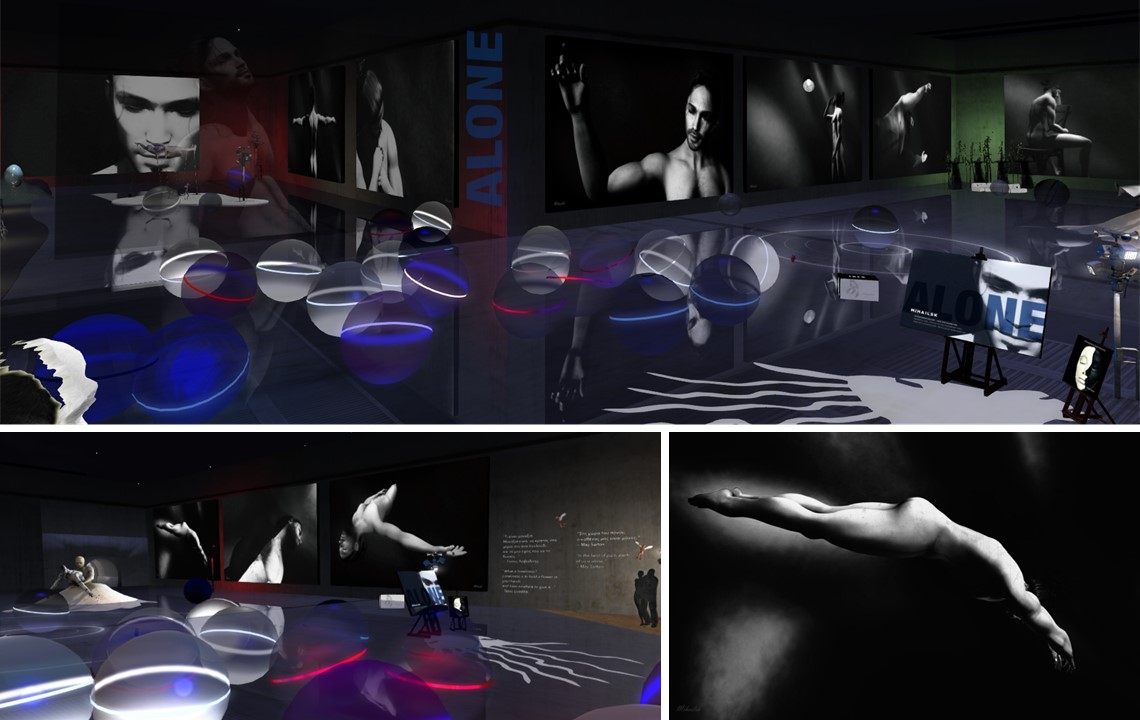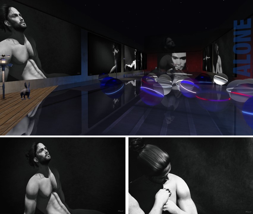 Maddy wrote: ““Reflections” is a journey of portraits that experiments with new ideas using A.I. technologies. The exhibit showcases photos created with Midjourney and Second Life Avatars, combined with the use of A.I. to create a melancholic and dark atmosphere that captures the essence of the subjects portrayed. The soft colors and blurs emphasize the intense emotions and intimacy of the portraits, inviting the viewer to immerse themselves in the images.”