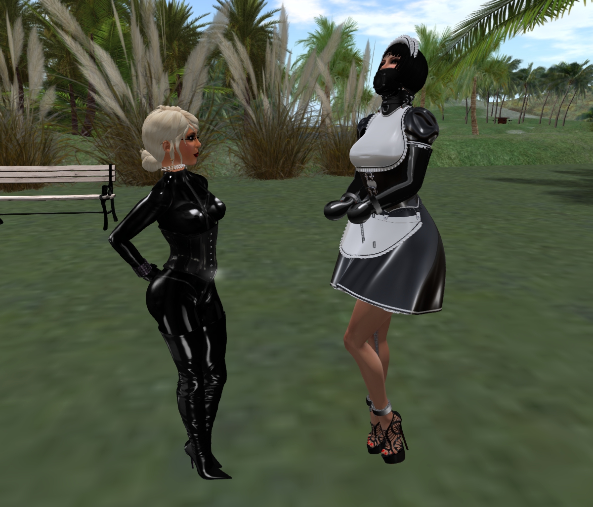 On October 8th, we had another family night that ended with Mii being a model for us. We took Mii with us and selected some clothes and gear for her so that she fitted to our slave Flo and sklavin Gebby. It is another outfit from KaS than the one the slaves are wearing, but we were satisfied with the result. That had to be documented.