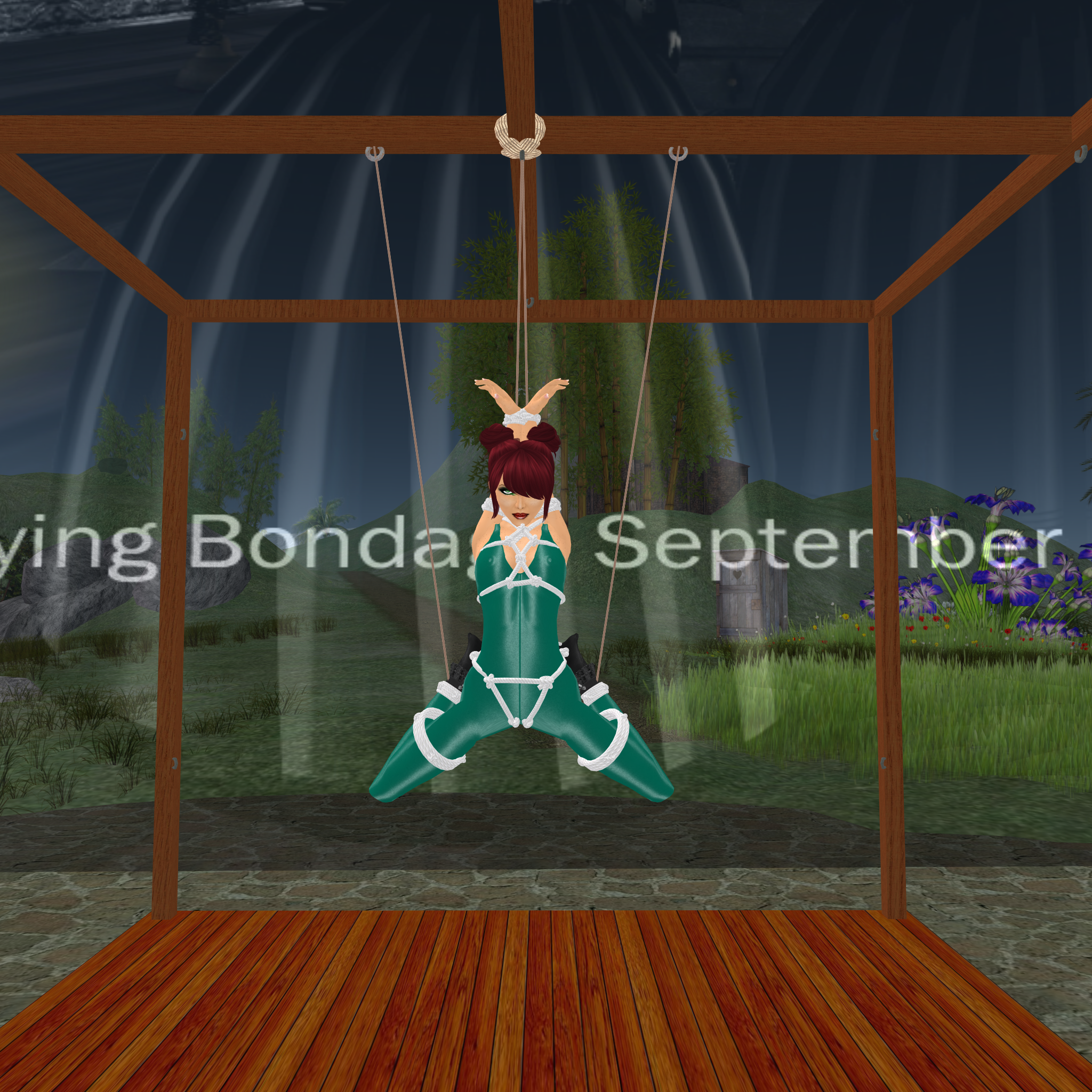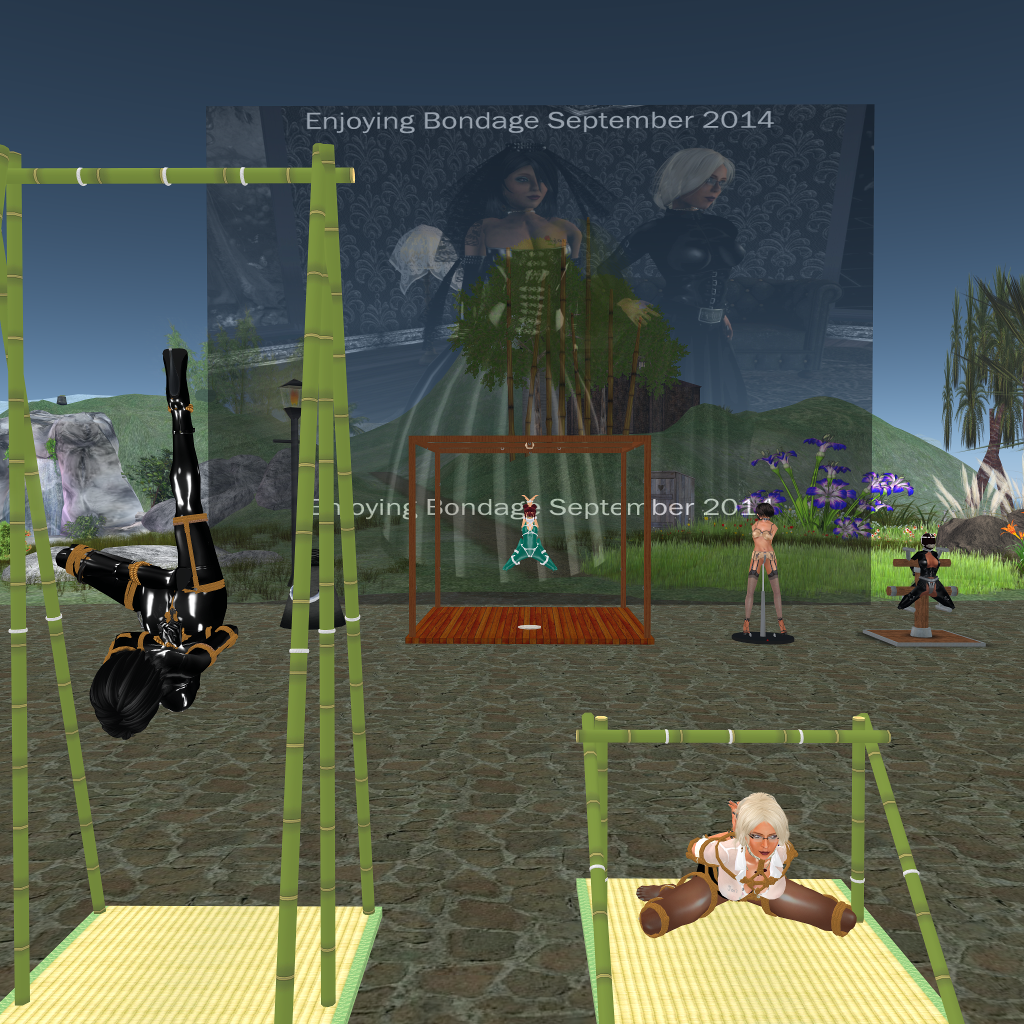 This time we planned doing something different for our bondage night. We put out some bondage frames and racks in front of our house and planned to get a row filled with our subs and random victims for this night. It began quite busy. I had caught Ashe (ashelia.difference), an old friend of ours who i didn’t see for years, in the morning – thus the first victim. Jenny caught another slave a few days before who we expected for the night (but she didn’t appear). At lunch time the set up was done, the court in front of the main house was filled with the frames and racks. When I got online at night Mii showed up and of course she was the first to get locked up. Then Ashe came, then rona, then slave flo – I was busy working to get all tied up nice and securely. Sarah was also around and she took the position of supervising.