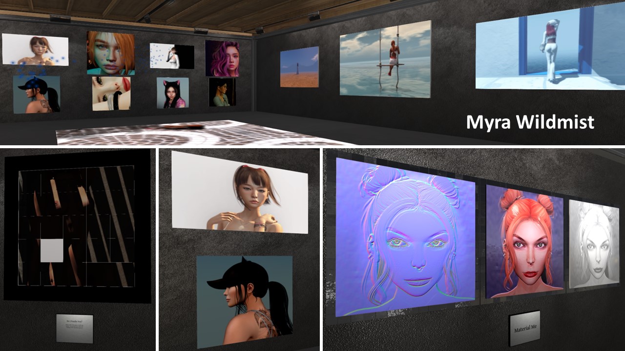On the 1st floor to the right you find the art of Myra Wildmist. According the the theme of the July exhibtion, Myra presents portraits, female portraits. One wall shows portraits of different characters and ethnics with different techniques for portraits, another wall is dedicated to females as an element of highlightening an otherwise boring landscape or background. I personally like her self portrait, which she presents herself with 3 different filter settings – quite a difference in my opinion, and proving what can be done within Second Life photography using simple filters.