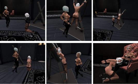 We took Flo to Carnal Intentions afterwards and slave Melissa joined us there. We stayed at Carnal Intentiones, chatted, teased Vanilla Meili, we caught up with slave Melissa and we just relaxed. After Flo had left for bed, we moved to Heavy Bondage Club for a short while.