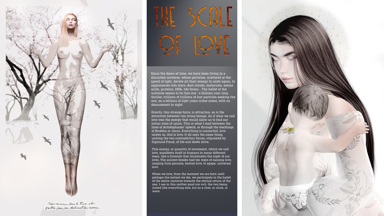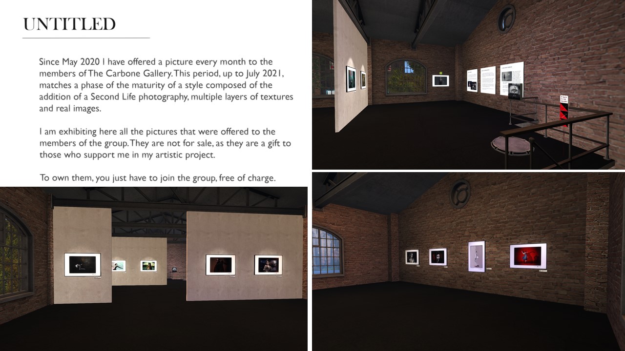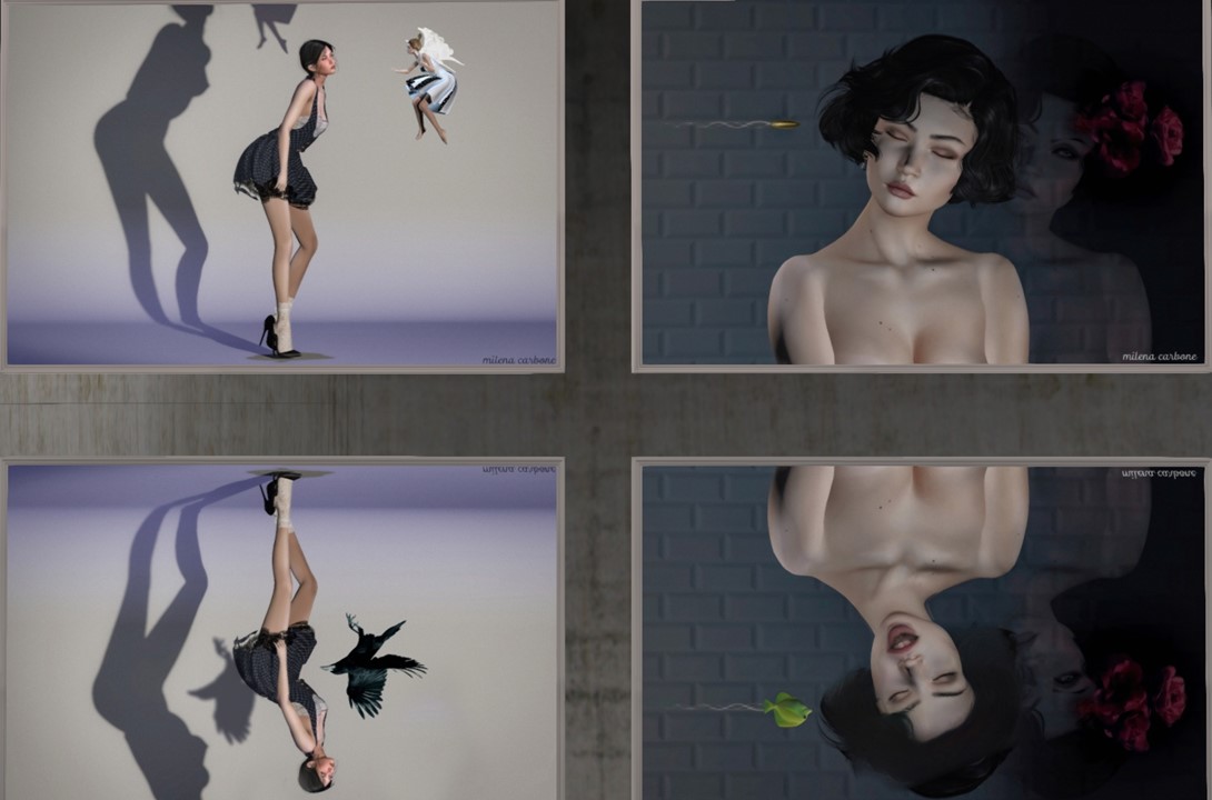 Milena Carbone (mylena1992) is a French artist and is in Second Life since mid 2019. She discovered its artistic potential and since then has devoted all her free time to creation, associating, as in real life, images and texts: “Milena Carbone is a fiction in which, as in any artistic work, biographical and imaginary elements are mixed.” Her creative process is iterative: some of her images inspire her stories and these stories modify the development of the image, which itself transforms the story.