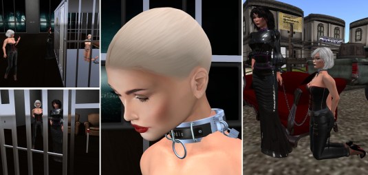 Saturday, October 16th, I met Mistress in the afternoon again. We were still wearing our corsets and our collars with the keys out. We spent time at Puerto Esclava and at Psi’s realm. At Pis’s realm one one the readers of this blog spoke to me and Mistress, happy to see us inworld. She was quite new to SL and unexperienced with regard to cuffs. And Mistress was in playful mode. Hence she instructed her to lock my collar and to leash me to the wall at Psi’s realm – of course without telling me. Mistress had fun with my protests but instinctively I suspected her behind this.