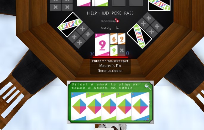 At night Mistress wasn’t inworld again due to her RL. When I came online I found Flo at the skipee table. She was wearing her gord doll suit, ready for me to lock. She looked funny at the skipee table – what a pose to play cards without hands!