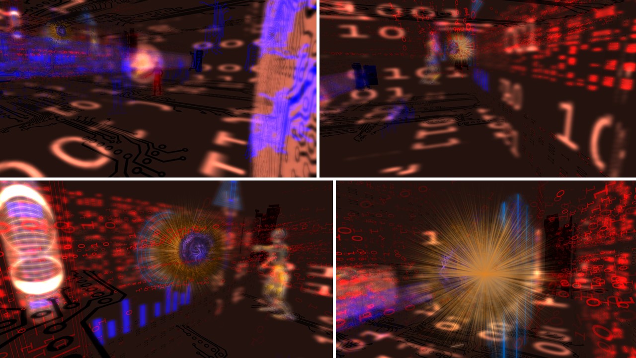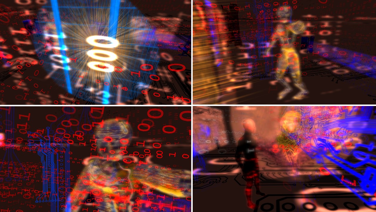 The picture is in the center of the installation, it is around the center of the installation shown in pieces, as if someone had cut the picture to destroy it, it is display at one wall together with a rope and noose and 2 single eyeballs. The woman and the man also appear to the left and to the right of the center installation as many holograms that jump up and down. What else? A frame in the center with many eyeballs that move around like billiard balls. Behind of this frame and under the central picture of the woman and the man is a music band, made of parts, a drummer and a singer and a music stand. And then there’s a colt levitating a bit aside of the intallatio and a projector.