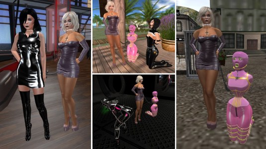 We descided to keep slave Flo and Sklavin a bit like twins. First we had them in similar restraints and catsuits. The more important change for them is that we enforced their rule to speak only when spoken to. We used a nice little tool (the STFU gag from Daisy Creations) for enforcing. That worked out nicely and we were envied for the obedience of our slaves. But even harder then being forced by a tool is to be forced by a simple command. This way we taught slave Flo to use emoting for describing what you can see and not for communication. Both slaves managed the assignment pretty well and were rewarded as we allowed them to enjoy eachother one night.