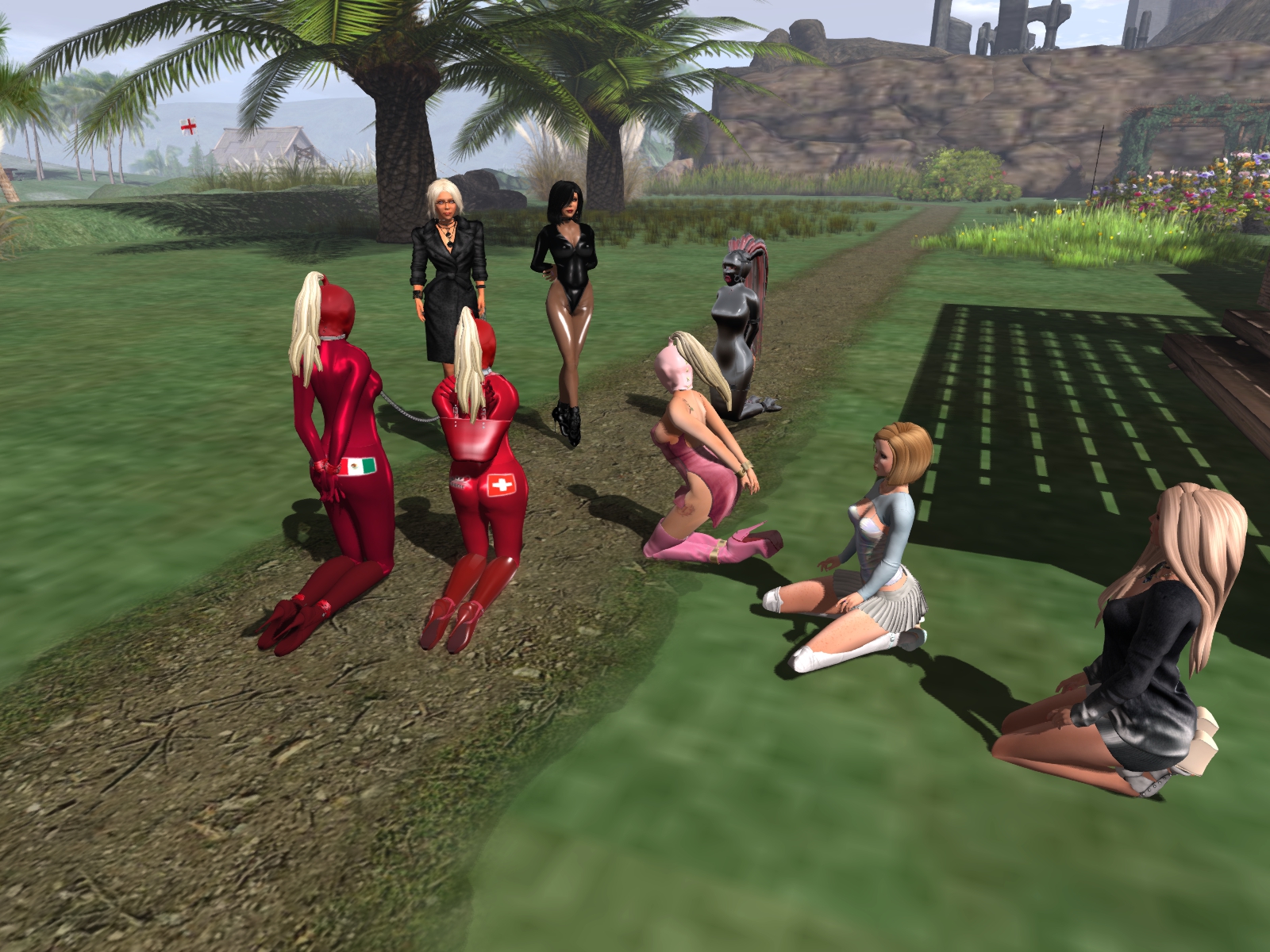 Over a month ago we put slave Flo into her red latex catsuit adding a red latex hood with black eyepads and a blonde pony tail. That day the new outfit for our slaves came to life. The outfit has been further developed and slave Adarra first added the “Maurer”-rose to the left buttock, then the national flag of the slave’s residence on the right buttock. Every slave got a different colour in a shade of red, pink, violet or liliac. And not only our permanently owned and collar slaves Flo, Gebby, Adarra, cecy and Nina were dressed accordingly but also Kitty. In addition we had or have slave Po, slave Mii, slavin C and slave Pauline in the very same outfit. In total 10 (!) slaves. When we go out, they add colour to every sim and they attract attention, in particular when they come online together. Everywhere we go with the slaves we get compliments and also application to join the group.