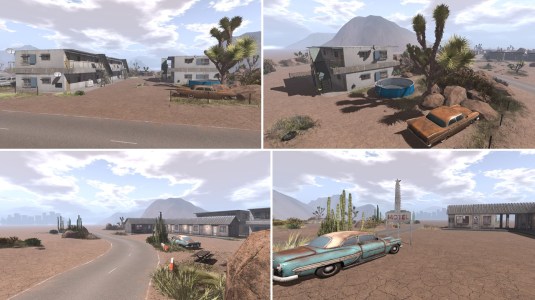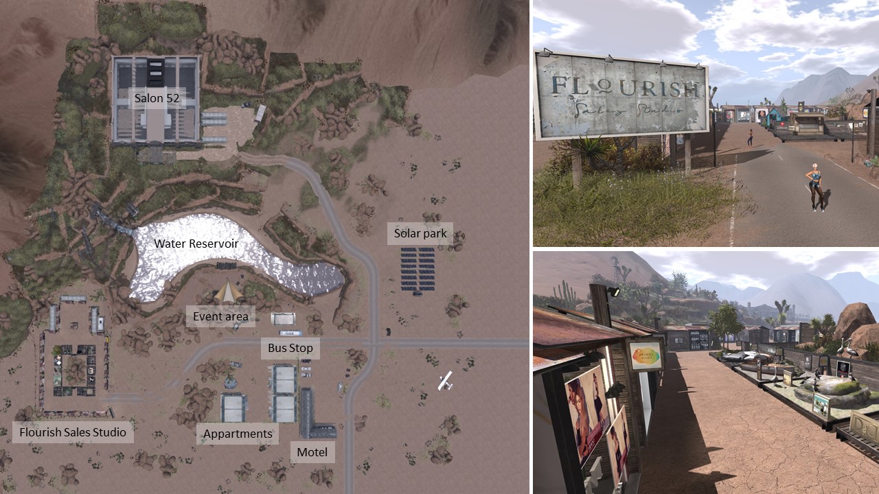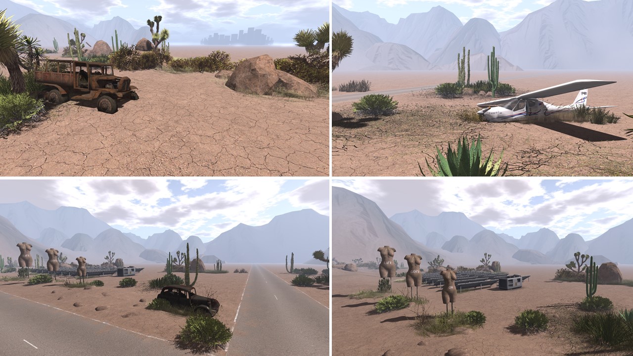 Walking further outbound you come along a motel, a crashed private jet plane (it is off sim already), a large solar park and a row of 3 huge female scultures which form the sentence “Life goes on”
