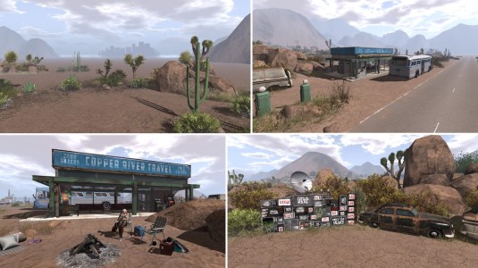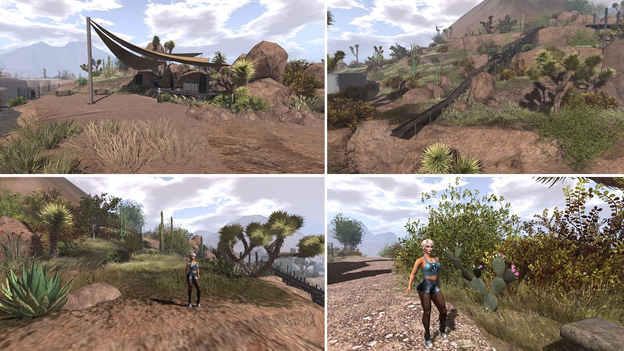 Besides being home for the above bi-monthly events Copper River is an outstanding designed place. It’s somewhere in a desert, the vegetation is dominated by cactuses, creosote bushes and shrubs. You can seemingly feel the heat of the hot sun burning on your skin. Far away on the horizont you make out the silhouette of a large city with skyscrapers. Roads lead in an out Copper River. The sim is perfectly embedded into the surrounding, some bushes and cactuses being off sim but you only notice it when you want to get closer and reach the sim edge. Same goes for the roads which lead far out of the sim. Chapeau!