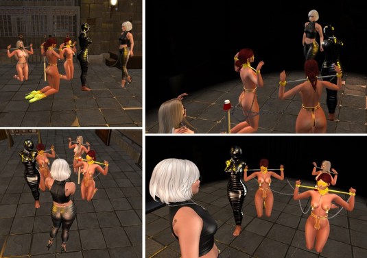 I took Flo, slave Holly, slave Alessi and slave Sakura to Psi’s realm for a little bondage night. It was comparably full there with some main chat. I tried out the next variation of Flo’s tape dress and added a tape hood. The slaves were all tied up equally. I got quite some nice pictures.
