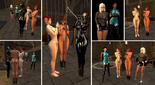 At night I ran late. slave Holly came inworld just seconds after me. She’s still staying at our skybox and we caught up with her news there. I had to pee, so I quickly used my toilet (slave Holly) before we went down to meet with pet and slave Faye. I decided to take the three slaves to Psi’s realm and then to tie them up a bit – spontaneously. And while I was busy with the locks and chains, Jenny came inworld and joined us at Psi’s realm. Jenny and I caught up with our news quickly, we had fun teasing the slaves for a bit and taking a few pictures. But all were tired that Sunday night, hence we returned home qutie early and called it a night.