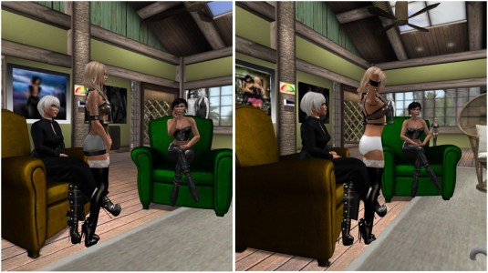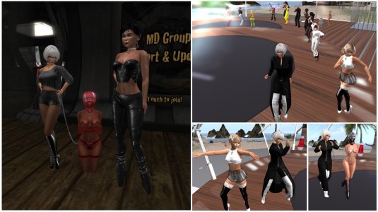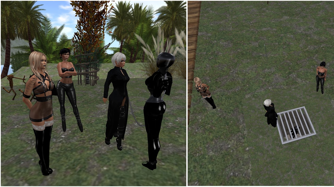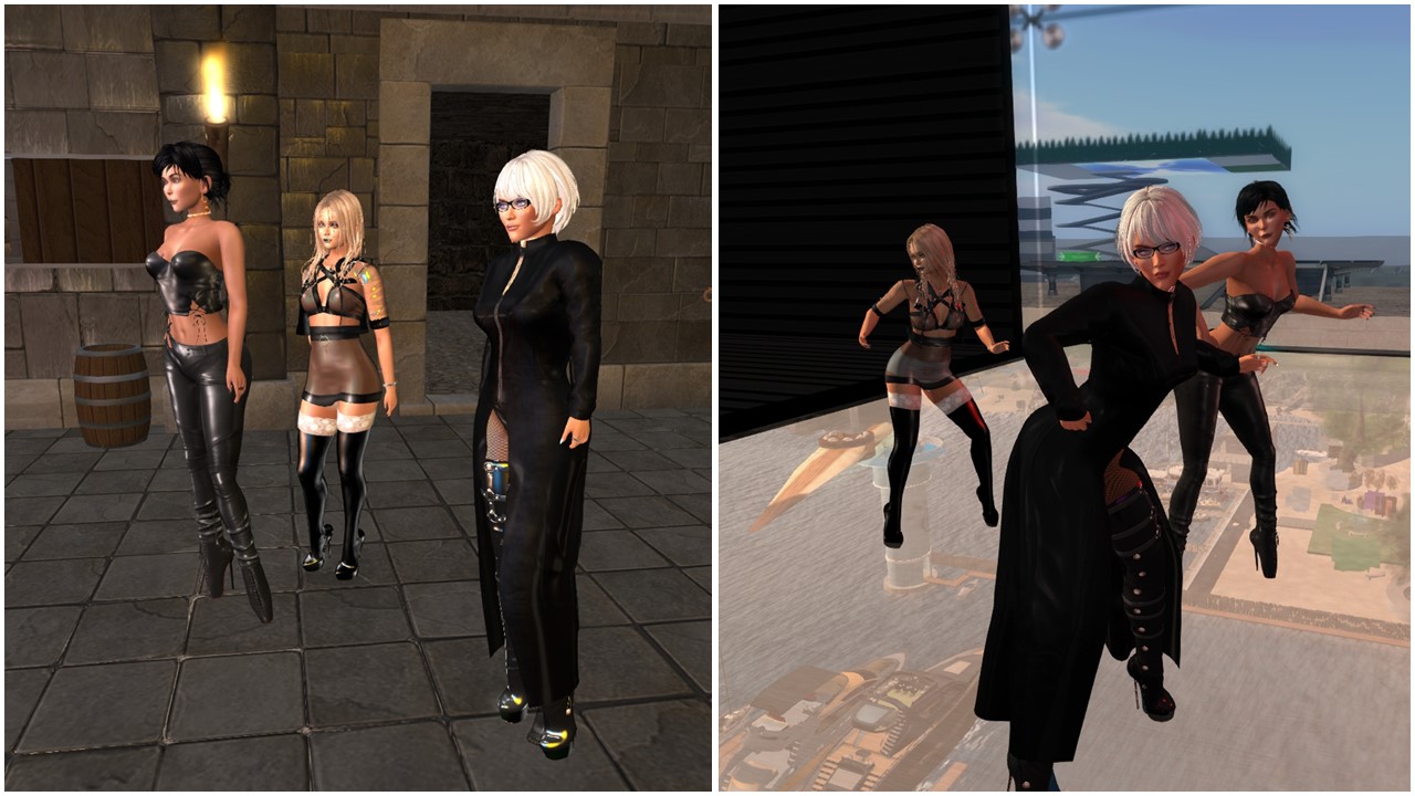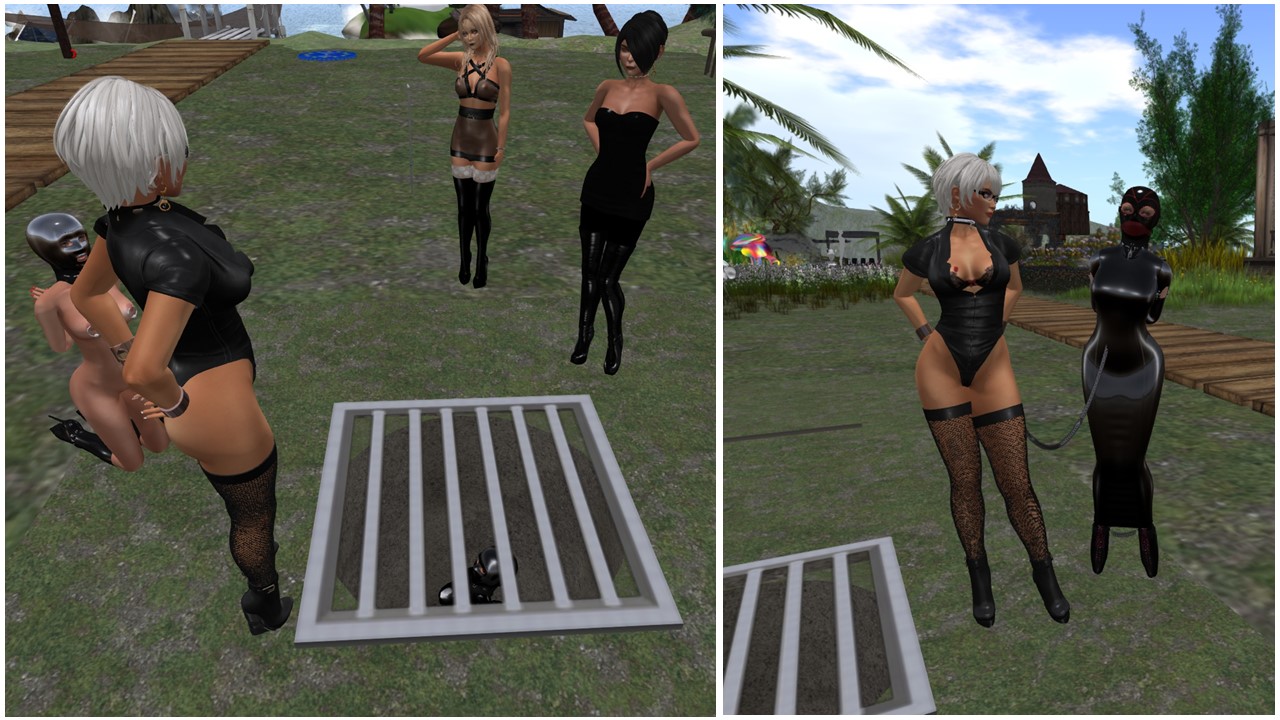 Mistress Jenny and Diomita with slave pet Christa at Mesmerize Dungeon / Diomita with slave Adarra at home at our Stonehaven wall / slave Bella at Psi’s realm