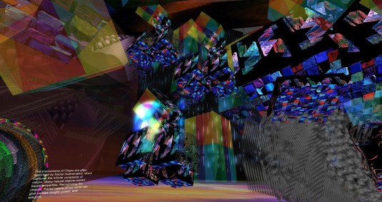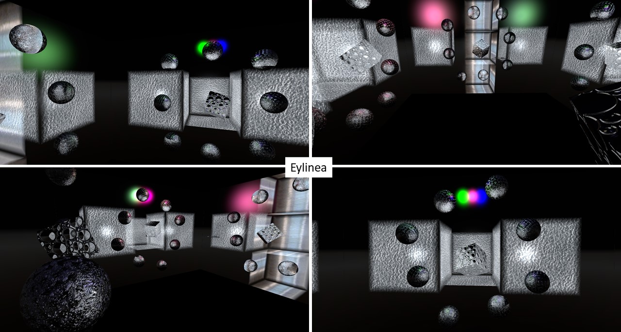 Eylinea is with 2,5 years also quite new to Second life, and I saw her art before also at La Maison d’Aneli and at VeGeTaL PLaNeT Gallery. And like Adwehe she’s still exploring the possibilities and trying out new things. Her passion seem to be objects and moving light effects. Her room in the current exhibtion at La Maison d’Aneli is filled with cubes and spheres. While some cubes stay fiexed at their places, the spheres and other cubes are constantly moving around on fixed routes, they turn and they shine and glow, producing different effects. It’s fun watching and letting your mind wander.