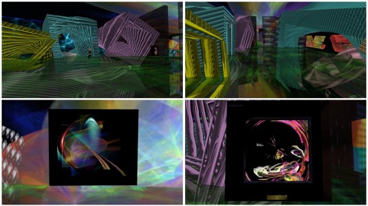 I started my visit with the skybox of Bebop Xue. Bebop is a French artist und in Second Life for over 12 years, yet I haven’t come across her before. Bobop’s skybox is devided in 4 rooms, the floor, the walls and the ceiling are animated with a light effects projecting combs on the surfaces and they are permanently changing. Bobop uses kind soap bubbles that rain from nowhere and vanish again. This way there is a steady motion in the exhibition box and the showcased pictures and the few hoovering 3D objects become more static. Her pictures are colourful, are often showing faces or scifi elements and are in my opinion really artful.