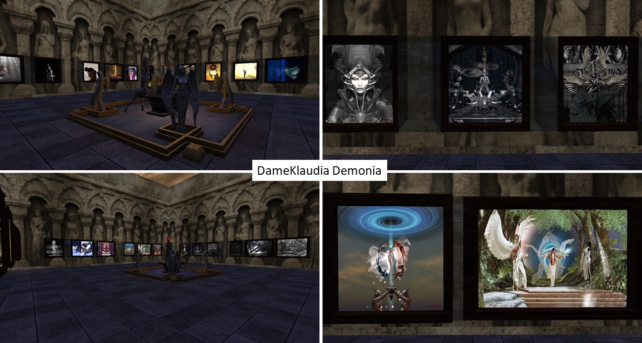 Her skybox at La Maison d’Aneli is an ancient temple with female statues embedded in the walls and in the center of the temple some angel statues. The four walls of the temple are used to showcase Claudia’s picture … most of them I’d categorise fantasy or scifi fantasy.