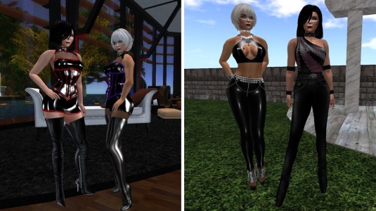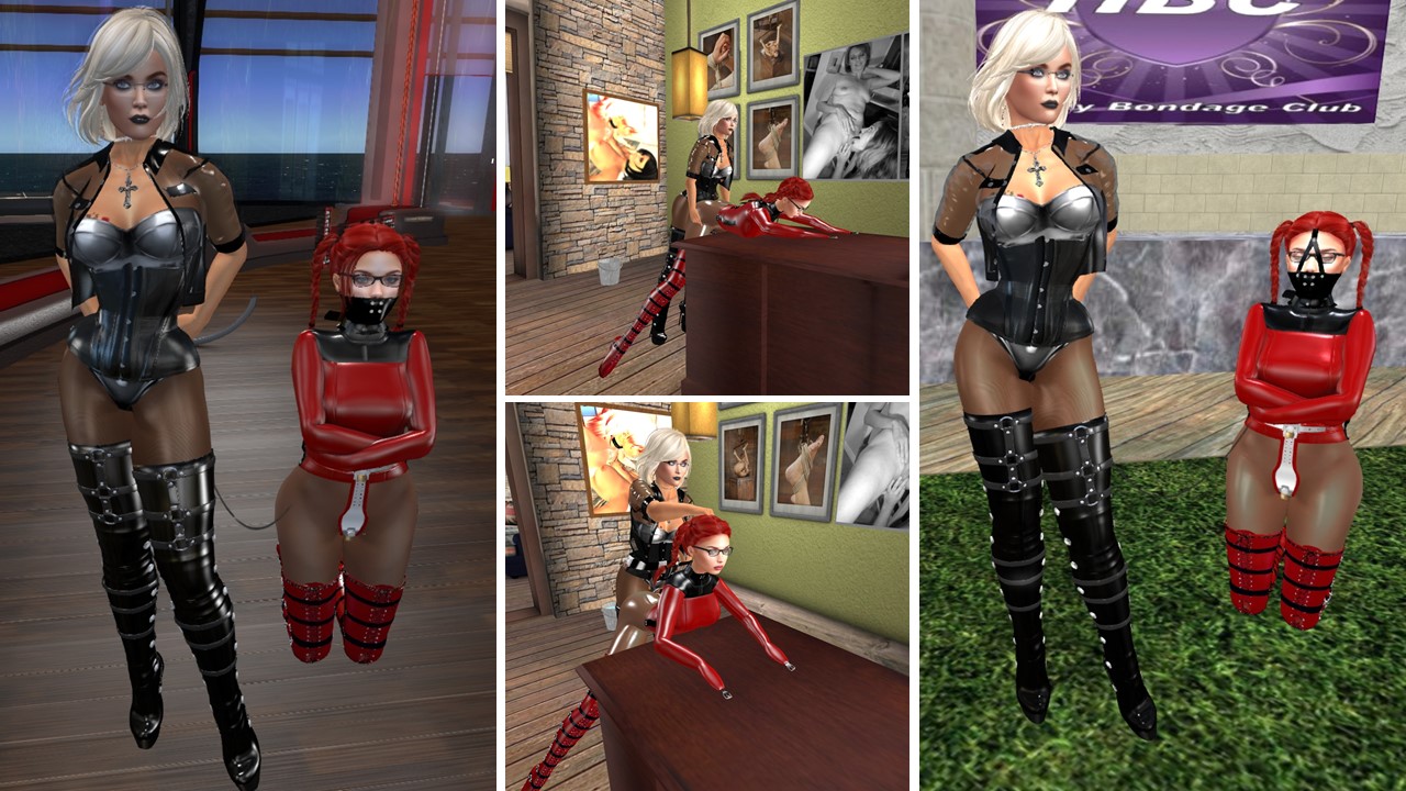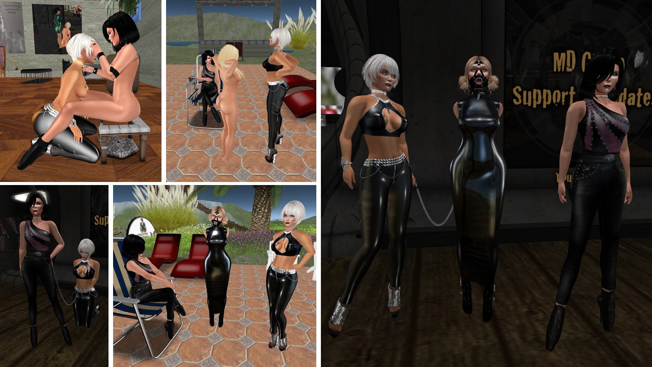 June 25th: Mistress Jenny and Diomita with Christin (ChristinVega) at our Stonehaven patio at home (left side) / Mistress Jenny exchanging my sub collar with the Ehesklavin collar at club DeLust