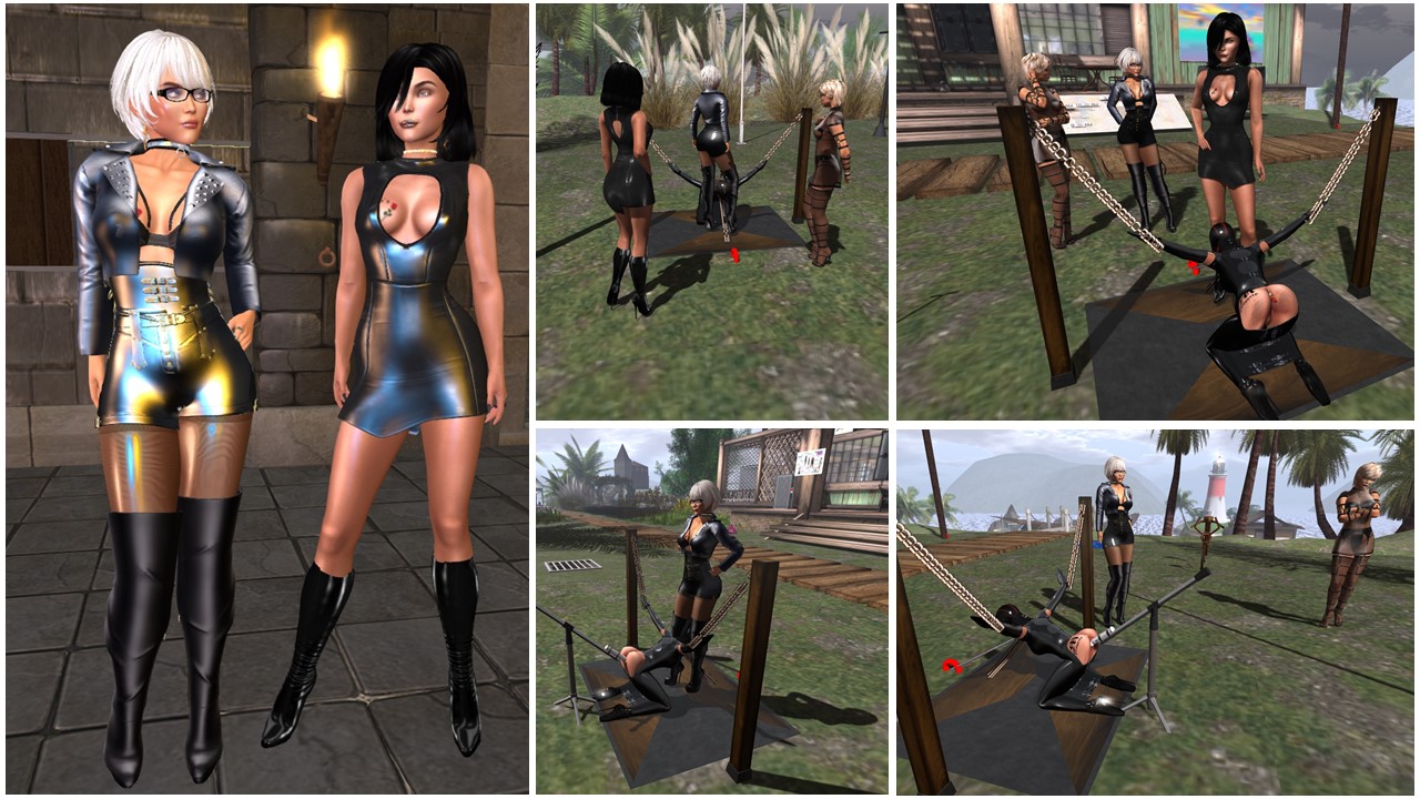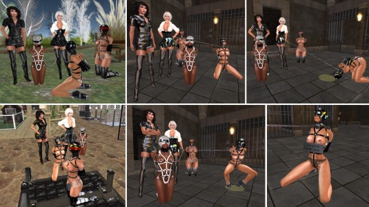 I planned another “Enjoying bondage night” for January. This time I wanted all 6 living latex dolls nicely lined up tied at Sarah’s patio. But it will be more or less impossible to get them all together on one single night. So my goal is to create a collage from 2 or three single nights. Last night was the first shot. slave Flo and slave Nina were online. I brought both to the patio and tied them up there. And of course it was fun tieing up the dolls and teasing them.