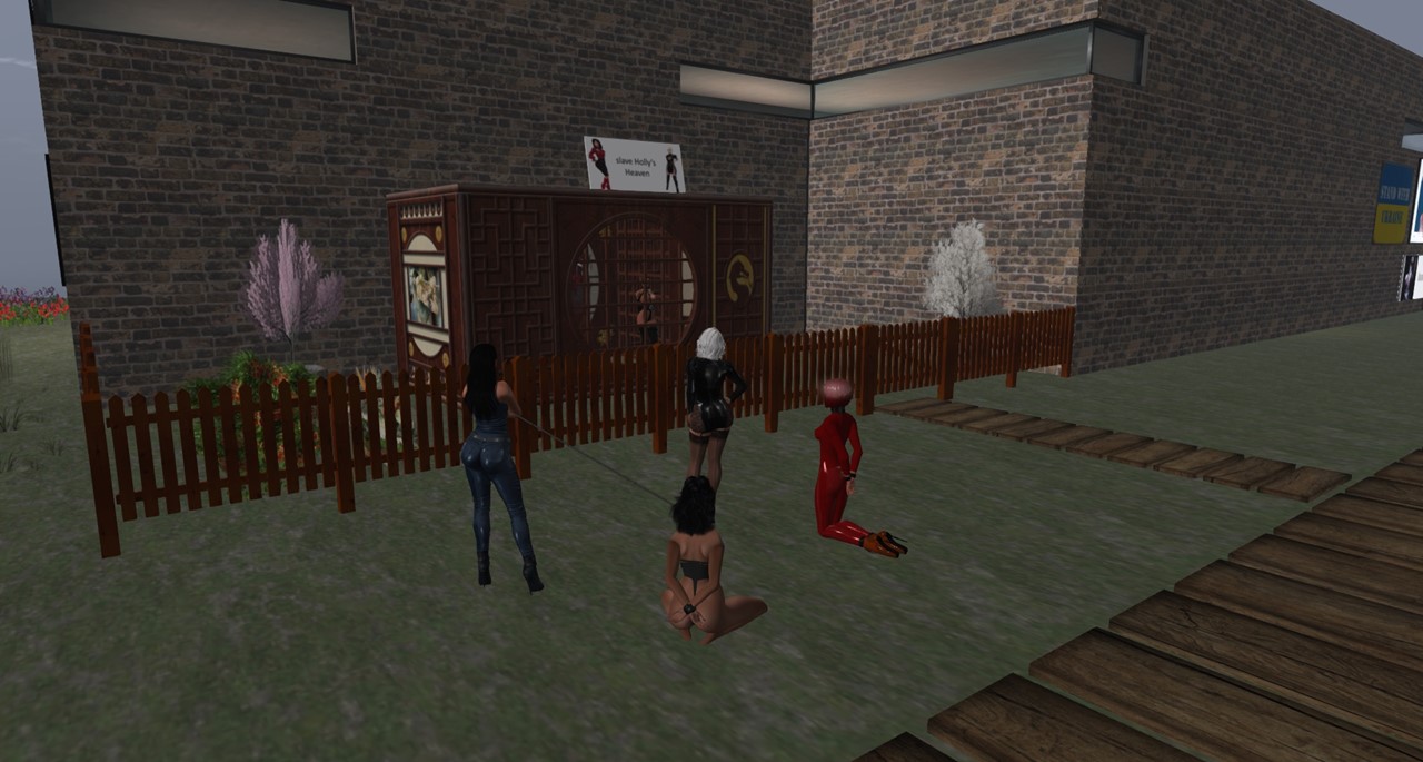 April 29th: Mistress Jenny and Diomita with slave Luci and slave Alessi at “slave Holly’s Heaven” at home – slave Holly just came inworld (in her room)