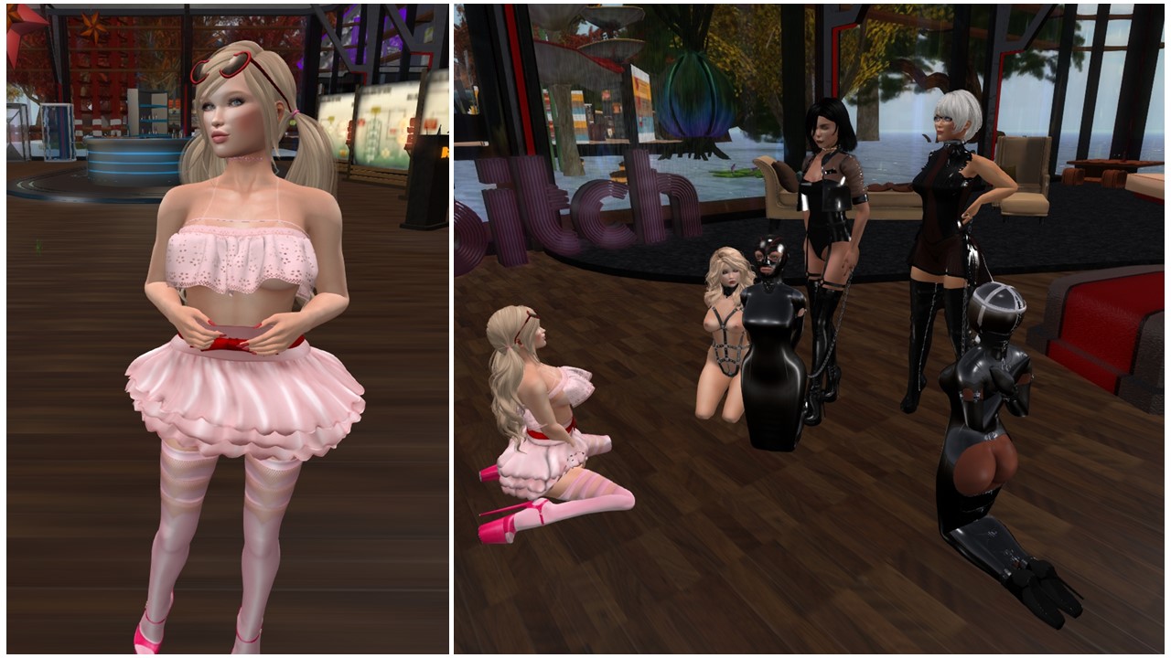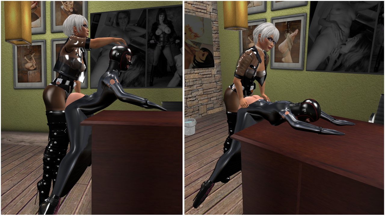 At night, Mistress Jenny wasn’t present again due to her RL. When I came inworld, Angelique was about to leave to bed. But I got my hug at least. slave kelly and slave Flo were inworld and I took them to our studio again. I was not fully satisfied with my new profile picture and made another one that better shows my sub collar. Now Mistress can decide which one I should use for my profile. slave kelly and slave Flo both waited patiently until I was done. I decided to take a studio picture of the slaves and me for our slideshow, then I took the slaves to Mesmerize Dungeon shortly and then to Psi’s realm again.