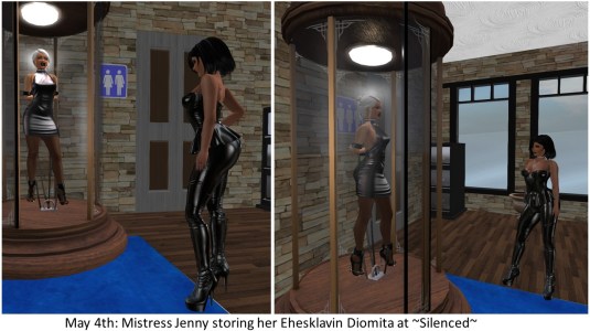 Mistress Jenny’s time online was limited Monday night. We took slave slut cecy, slave Flo and cow Kitty to the Lesbian Society and had a look at the current picture gallery there, which is about submission. I didn’t take a picture there but I took one at home which is quite funny as it looks as if Mistress is using me as a leash holder for the slaves. After Mistress Jenny left, I took slave slut cecy to ~Silenced~ and objectified her as a statue. That’s it for this diary entry.