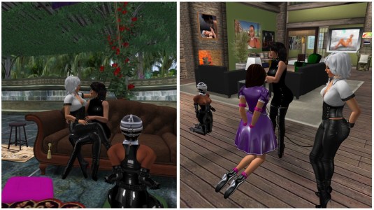 When I returned home from my simploring tour to “Aly’s Fine Art Gallery and Jungle” Thursday, August 17th, Mistress came just inworld. She didn’t talk much, instead I got orders to wear cuffs, which she locked. She added an inflatable gag, leashed me and took me to club DeLust. It still surprises me how self confident and strict Mistress takes what is hers with no doubt. At club DeLust she first leashed me at the wall, then sat down in a chair and began chatting with another guest, Keiko (keikonami). Keiko, who I know from an simploring tour to her castle (read here) congratulated Mistress Jenny for having enslaved her former owner (me). She told Mistress that she gave up her castle (what a shame!) but has a new smaller place and promised to invite Mistress and me over some day. As I was gagged I just followed Mistress’ and Keiko’s conversation silently. I do remember that I did that with Jenny as well many years ago. After a while, Mistress took me next to her, kneeling between her and Keiko. And when a sub of Keiko showed up, I was finally allowed to sit at Mistress feet.