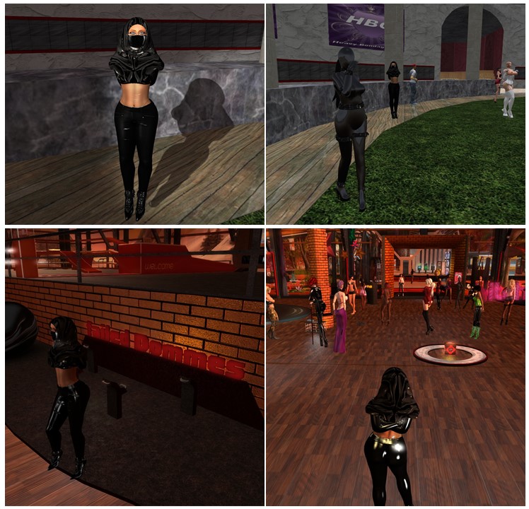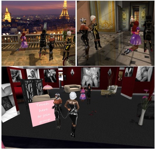 August 7th: Mistress Jenny with Diomita and slave Flo at Mesmerize Dungeon (upper left) and at The Secret House (upper right), with Sissy maid and Argi at home (lower left) and at Club DeLust (lower right)