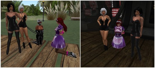 August 17th: Mistress Jenny and Diomita with slave Flo and sissy maid at home (left) and with Sissy maid at Mesmerize Dungeon