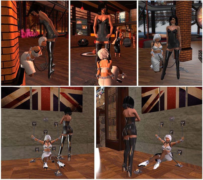 After club DeLust Mistress took me to Domme a Domme and tried out some of the animations there. She had fun with her Ehesklavin. Finally she took me home and locked me in our skybox for the rest of the afternoon. I took a picture of it. As the hooks are arranged just below of the Union Jack I had in mind a title for the picture “Rule Britannia” *laughs*. Doesn’t it look like it?