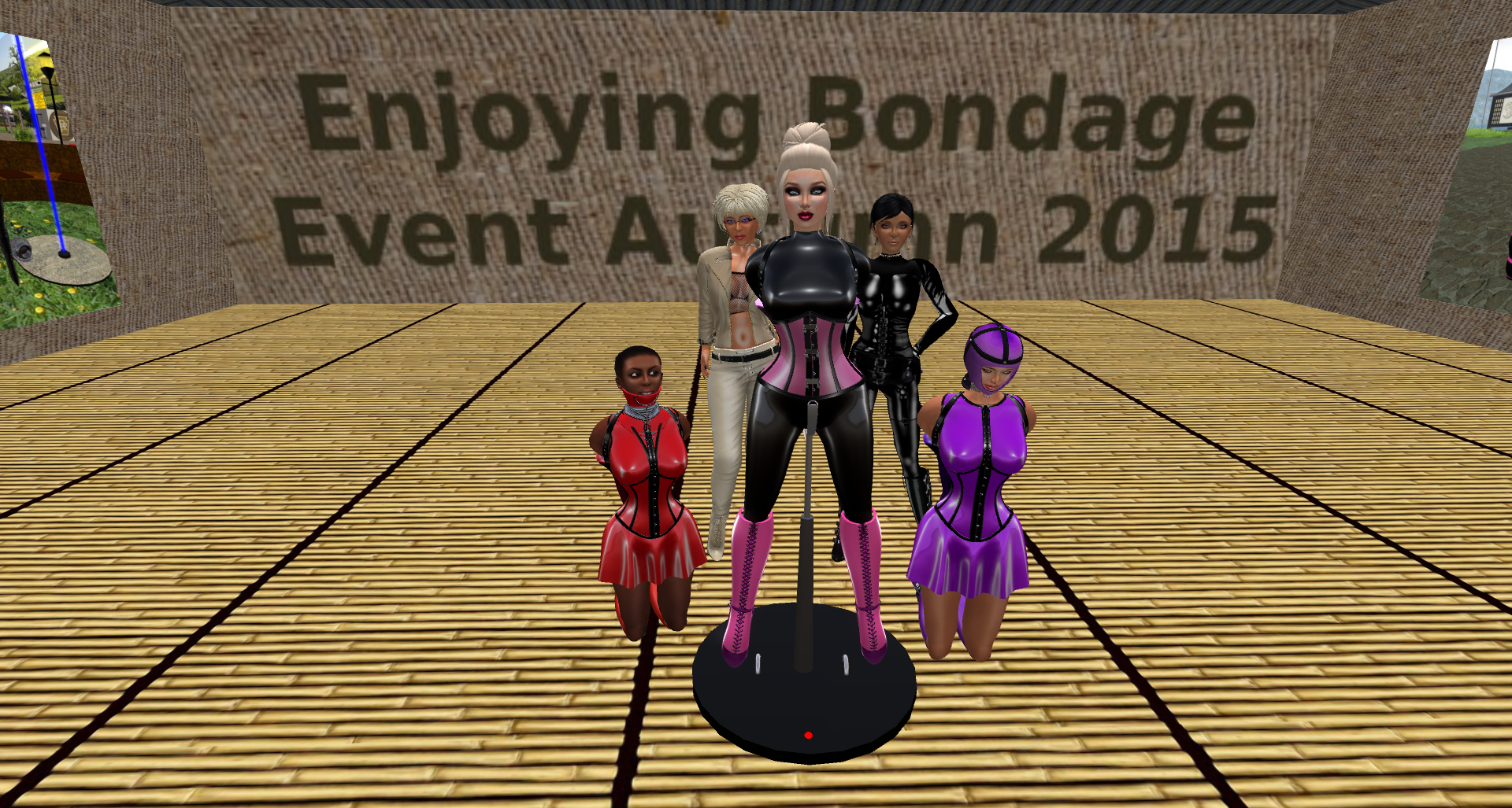 August 4th at MD – a backside view: slave cyan, Mistress Jenny, slave Flo (saying good night), slave pink, Diomita and slave L