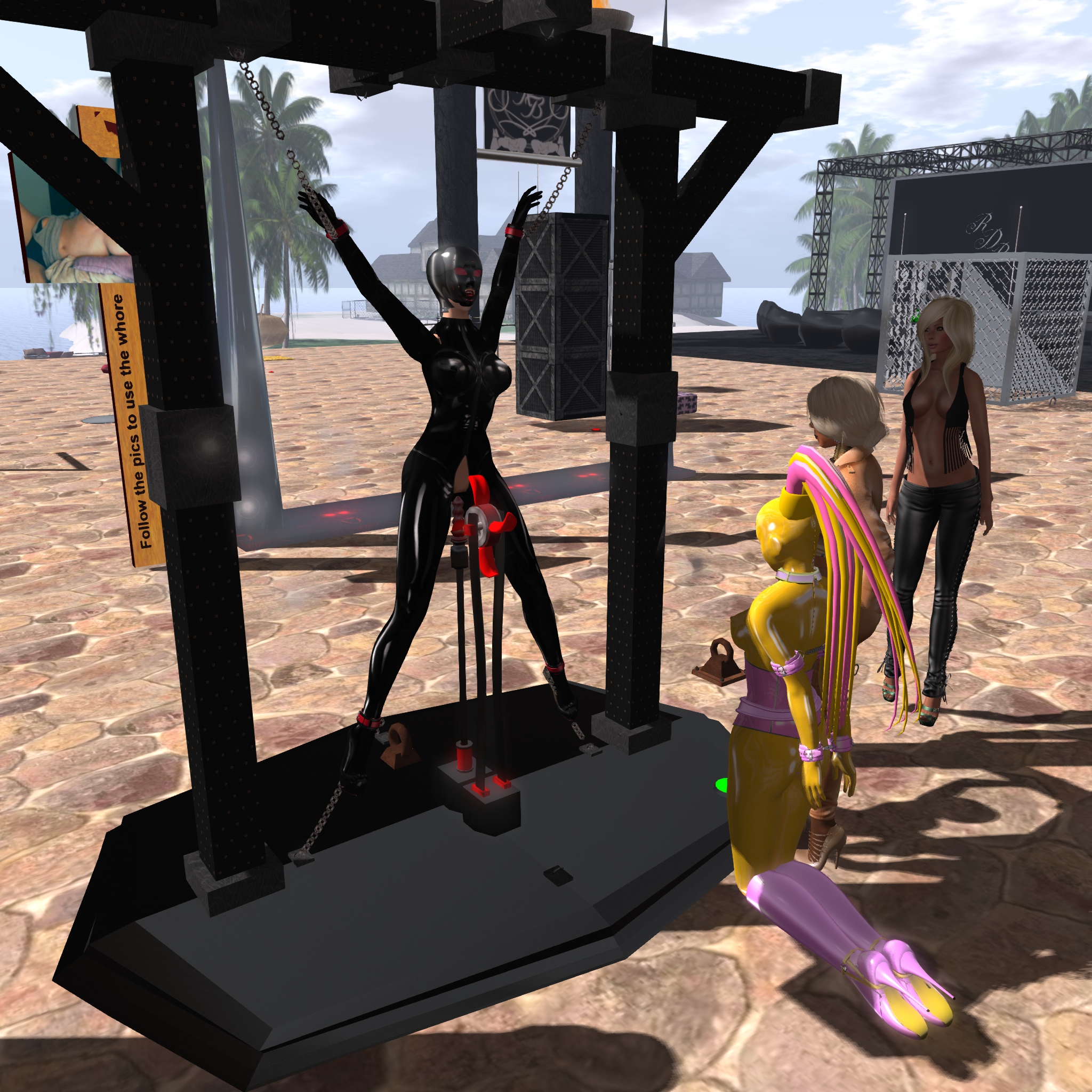 Monday, August 1st, we began to fit our slaves into their new midsummer outfit. It is according to midsummer something very little – a naughty harness colourable in 100 different colours and reveals the slave’s breasts and pussies. We added a RR armbinder and just to be prepared for any misbehaving a RR ringgag. That’s it – simple and sexy. slave Nina and slave cecy were the first who were put in their next outfit. When we were done and satisfied with their appearance Mistress Jenny and I took the slaves to Mesmerize Dungeon to expose them.