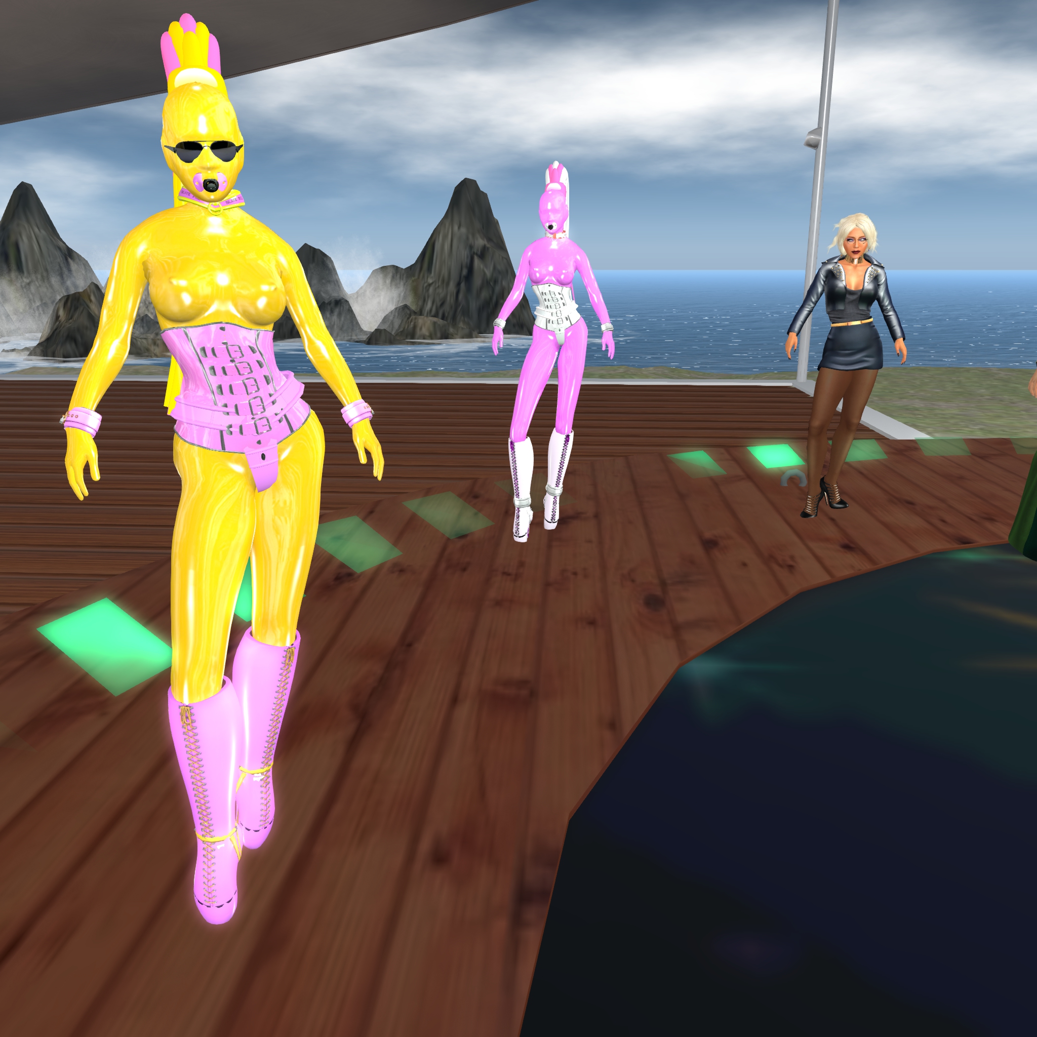 Tuesday, August 2nd, we put slave Flo in her new midsummer outfit. She choosed yellow and that’s quite outstanding. Pauline asked to joined and for her we selected a green harness. So far the slaves are yellow (Flo), cyan (cecy), red (Nina) and green (Pauline). Should we call them by their colours? At least a nice idea, isn’t it? After fitting the new outfit we took the the yellow, the cyan and the green slave to Lochme and enjoyed some chatting and banter.