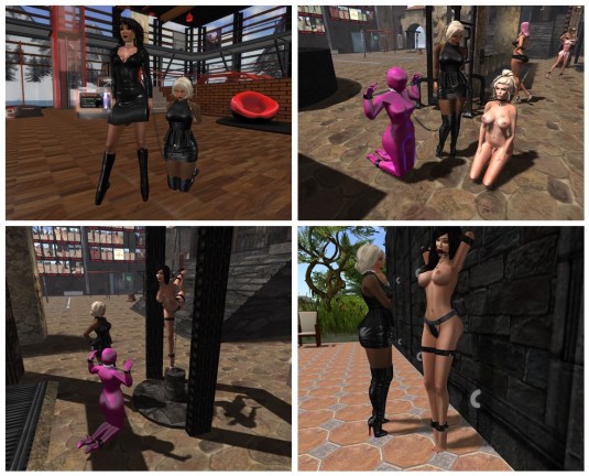 January 11th: Mistress Jenny and Ehesklavin Diomita at Domme a Domme (upper left) / Diomita with slave drone Flo and Moon (Thom2T) at Ropers playground (upper right) / Diomita with slave Adarra and slave drone Flo at Ropers Playground (lower left) / Diomita storing slave Adarra at our Stonehaven wall at home (lower right)