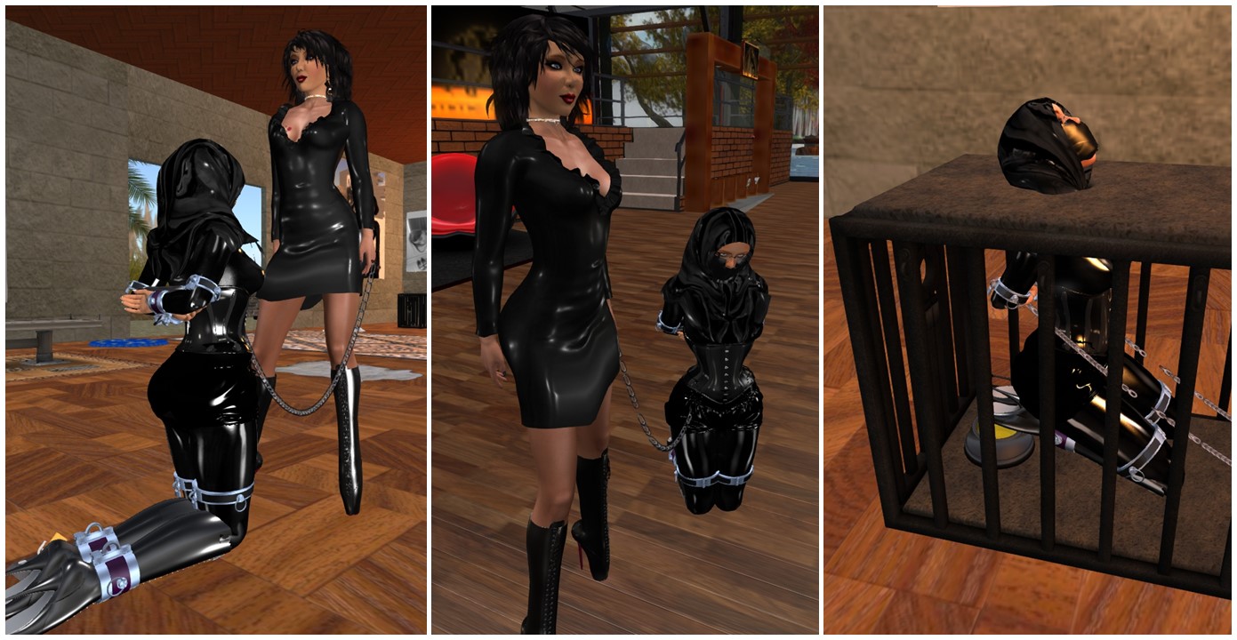 Wednesday, February 7th, slave drone Flo had something to celebrate in RL and we decided to show her face and to lower her restrictions. Angelique gave another lesson to me about how to use her wardrobe and I selected a dress for this night. We went to Satyr club to celebrate and to dance and had a nice time there and chatted among us. When slave kelly came inworld I summoned her (and with her the slut cage she’s fixed in) and we stayed a bit longer. We moved on to Mesmerize Dungeon after slave Flo had left for bed. Angelique stood a bit aside and it took some persuasion to get her closer to us.