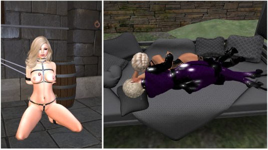 Mistress Jenny and I went to our Stonehaven patio with slave kelly, slave Bella and Angelique and got entertained by slave Bella, who was fiexed on the tubular boobular rack. Soon the moans of both slaves and the noise of the 2 fucking devices could be heard. It was Angelique’s part to decide and she denied an orgasm for the slaves, poor slaves! When it was time for bed, I chastitied both slaves again and we left them quite frustrated.